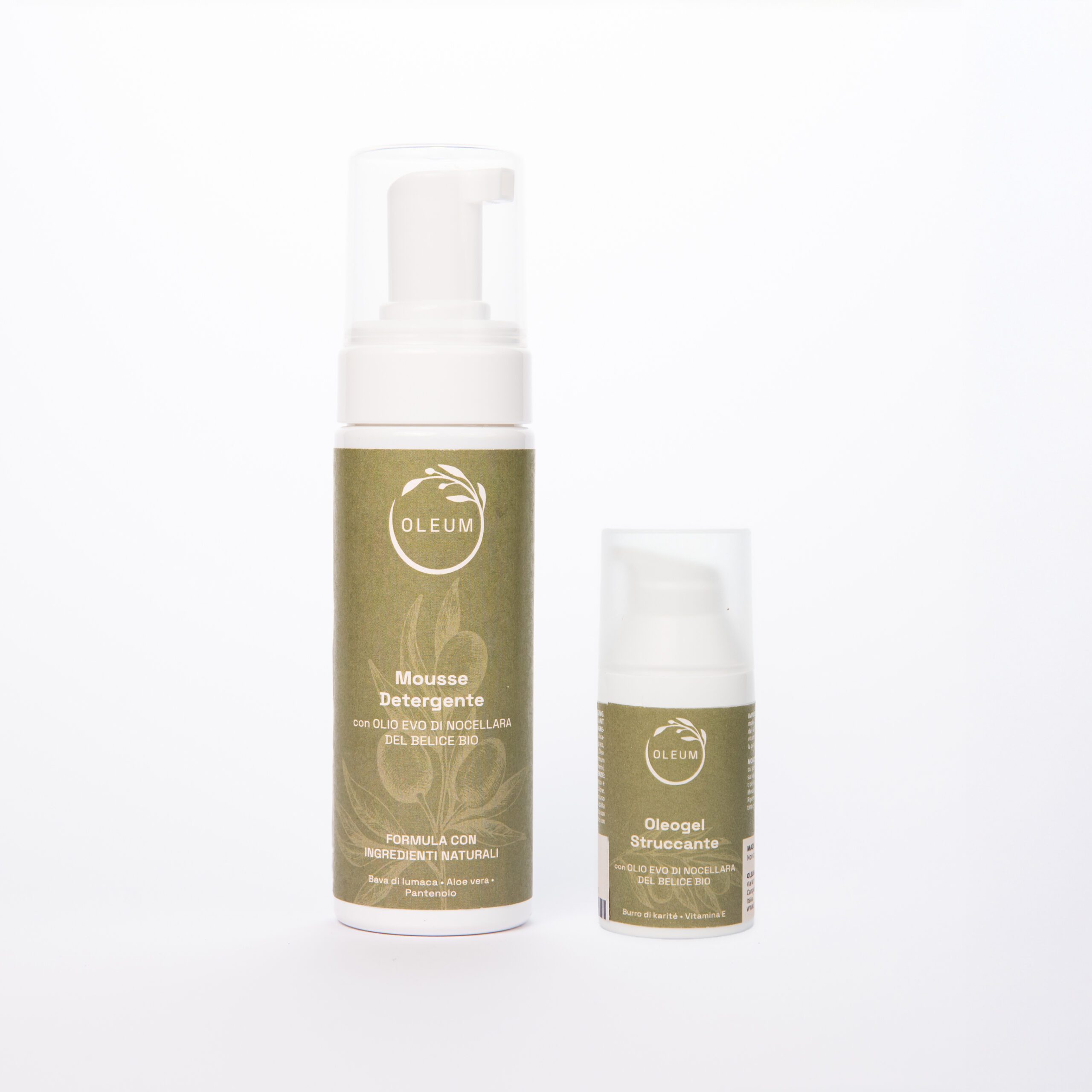 Set viso completo per la doppia detersione: Oleogel struccante e Mousse detergente per una pelle pulita, morbida e radiosa.